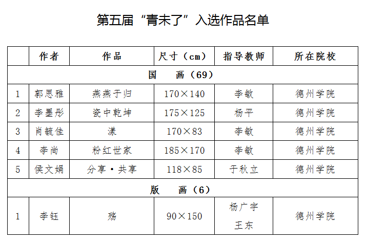 第五届“青未了”初评共收到37所高校报送的865件作品照片。共评出345件作品入围复评。复评实际收到34所学校报送的332件作品原件。经过评委严格评审,最终评出入选作品290件,我院选送的作品最终入选国画组5件、版画组1件。