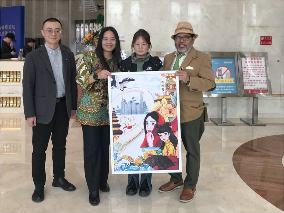大使一行对展览的水平表示了赞赏,大使及夫人收藏了以马健老师以荷花为主题的中国画作品,印尼驻华使馆经济处公使参赞收藏了21级视传专业吴秋艳同学以中印尼两国艺术元素为主题的海报作品。