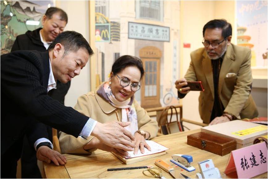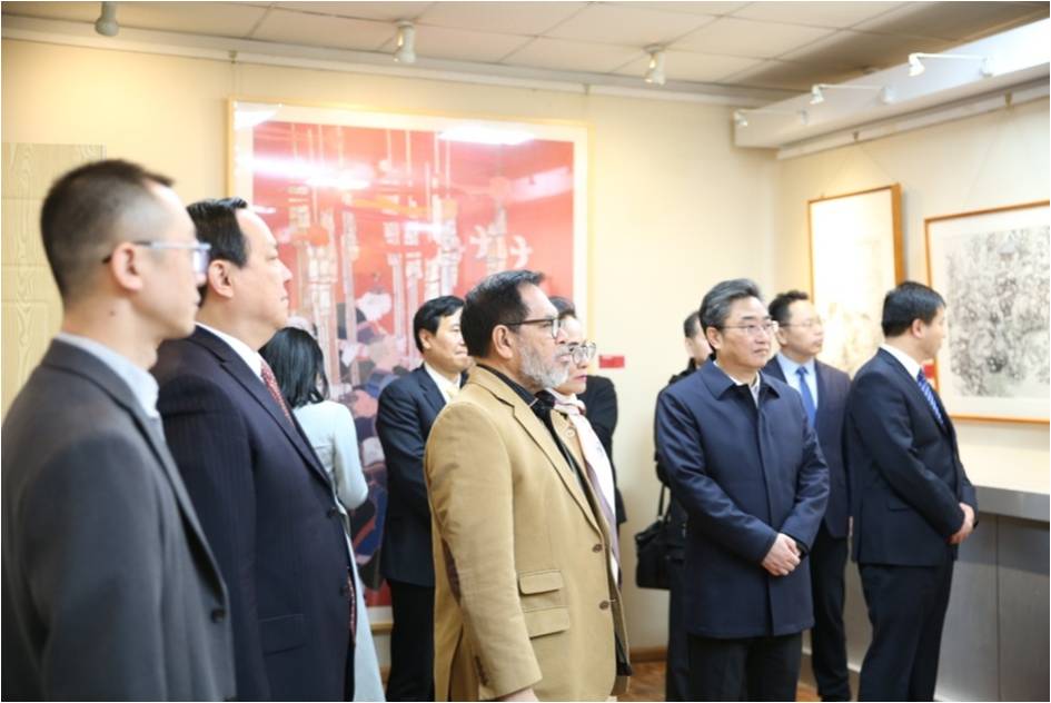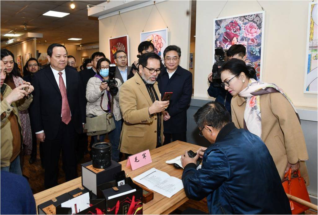 此次展览艺术种类丰富多样、作品精美,在讲解员的介绍中,大使一行不时驻足欣赏一件件艺术作品,观看德州地域民间艺术家的现场表演,并亲手体验了“非遗”剪纸创作,感受中华传统文化的独特魅力。