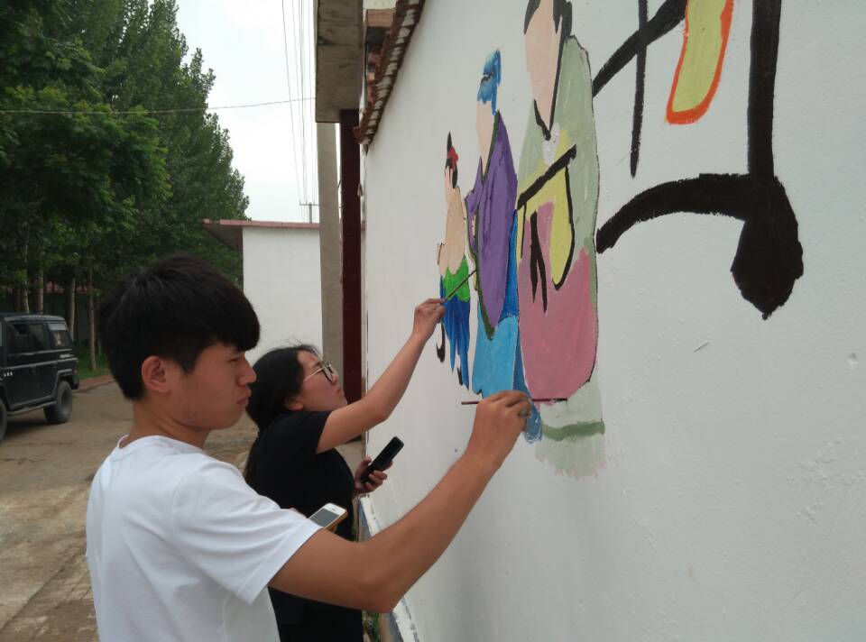在理合务镇东宫村,青年志愿者绘制了“礼敬中华”系列文化墙绘,包括“闻鸡起舞”、“程门立雪”、“岳母刺字”、“孔融让梨”、“铁杵成针”、“卧冰求鲤”等系列文化故事和“尊老、爱幼、明礼、守法”文化宣传等内容。