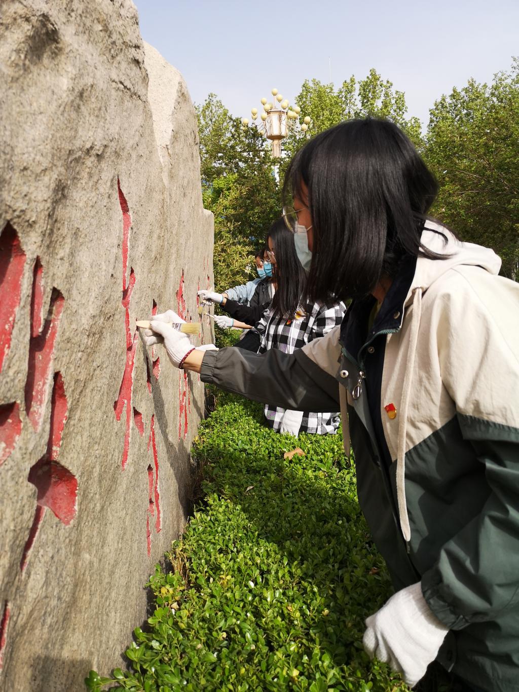 4月28日,海角天涯风景图片党总支组织学生党员开展“我为校训石洗尘描红”志愿服务活动。